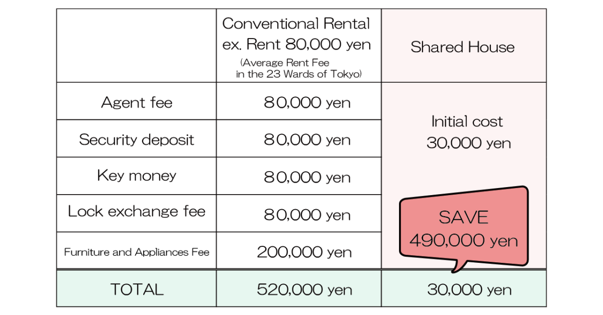 In the case of conventional rentals in Japan, there is a need for upfront costs such as security deposit, key money, and agent fees,